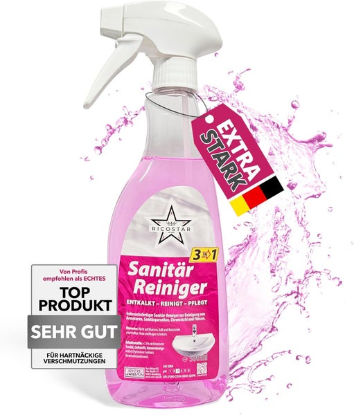 Ricostar Sanitärreiniger 500 ml – 3in1 Badreiniger für hygienische Sauberkeit – Kalkreiniger ideal für Sanitärporzellan, Amaturen, Chromstahl & Fliesen – Badreiniger-Spray gegen Kalk & Schmutz