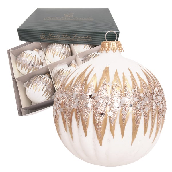 Riffelkugeln mit Glitter & Sternen, Weiß & Gold Satin, 8cm, 6 Stck., Weihnachtsbaumkugeln, Christbaumschmuck, Weihnachtsbaumanhänger