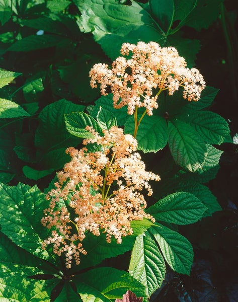 Rodgersia x henrici, das Schaublatt, ist eine eindrucksvolle Blattschmuckstaude mit markanter Präsenz im halbschattigen bis schattigen Garten. Die großen, handförmig geteilten Blätter treiben im Frühjahr oft bronzerot bis kupferfarben aus, vergrünen im Sommer zu sattem Dunkelgrün und setzen dadurch lange vor und nach der Blüte dekorative Akzente. Von Juni bis Juli erscheinen auf kräftigen Stielen luftige, rispige Blütenstände in zartem Rosa bis Rosé, die über dem Laub schweben und dem Beet eine elegante, fast exotische Note verleihen. Der horstige, langsam ausbreitende Wuchs macht Rodgersia x henrici zu einer langlebigen Gartenstaude, die als Solitärstaude ebenso überzeugt wie in Gruppenpflanzung, am Gehölzrand, im Schattenbeet oder entlang von Teichrand und Bachlauf als wirkungsvolle Uferpflanze. Auch in großen Kübeln auf der schattigen Terrasse entfaltet dieser Blüten- und Zierblattschmuck seinen Reiz, sofern eine gleichmäßige Wasserversorgung gewährleistet ist. Bevorzugt werden humose, nährstoffreiche, frische bis feuchte Böden, die gut durchlässig und dauerhaft gleichmäßig feucht sind; Trockenheit und heiße Mittagssonne sollten vermieden werden. Eine lockere Mulchschicht hält die Feuchtigkeit, während gelegentliche Kompostgaben den kräftigen Austrieb fördern. Verblühtes kann bodennah zurückgeschnitten werden, der Hauptschnitt erfolgt im ausgehenden Winter, wenn das alte Laub Platz für den neuen Austrieb macht. In Kombination mit Farnen, Funkien und Astilben entsteht ein stimmiger, langlebiger Pflanzenteppich, der schattige Bereiche im Vorgarten oder im Staudenbeet eindrucksvoll strukturiert und den Blütenstrauchbereich harmonisch ergänzt.