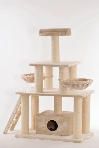 Rohrschneider Katzenbaum GinniBeschreibungDieser große Kratzbaum bietet das komplette Katzenprogramm. An den extra starken Holmen (ca. 12cm dick), die mit Natursisal umwickelt sind, kann nach Herzenslust geklettert werden. Aufgrund ihrer Größe bietet die Bodenplatte (ca. 100x58x4cm) optimale Standsicherheit. Die oberen Ebenen, 2 Hängemulden und eine runde Liegeplatte laden zum Ruhen und Beobachten ein. In der geräumigen Höhle kann sich Mieze jederzeit zurückziehen und ein ausgedehntes Nickerchen machen. Die seitlich angebrachte Leiter erleichtert auch kleinen oder älteren Stubentigern den Aufstieg. Alle Liegeflächen sin mit einem weichen Plüsch bezogen, der besonders dicht gewebt ist. Die hohe Qualität der verwendeten Materialien machen diesen Katzenbaum einzigartig und lange haltbar. Die Lieferung erfolgt zerlegt inkl. Aufbauanleitung. Gesamtmaß: B100xT58xH155cm