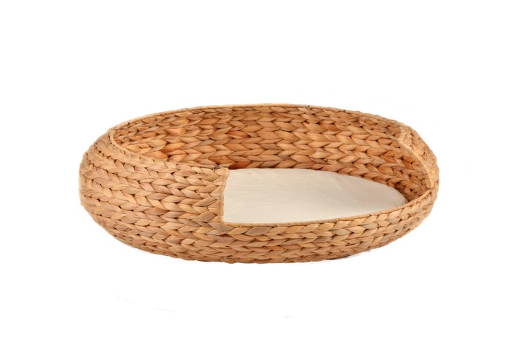 Rohrschneider Tierkorb Bira Gr.3BeschreibungDer Katzenkorb ist aus einem Metalluntergestell und mit Wasserhyazinthe umflochten. Bezug abnehmbar mit Reißverschluss, Schaumstofffüllung, Kissen D50cm. Gesamtmaß: D62xH18cm