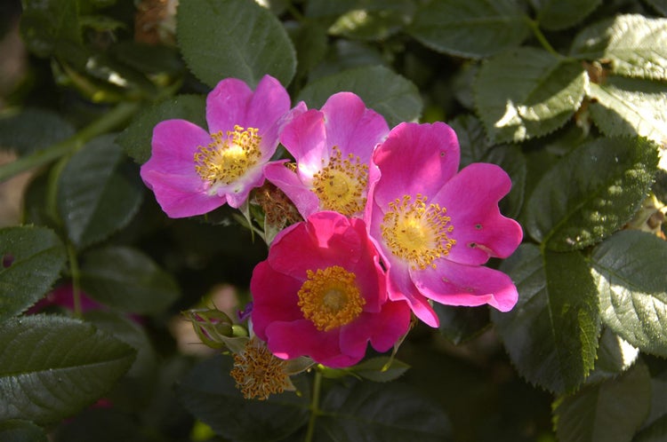 Rosa carolina, die Carolina-Rose, ist eine ursprünglich wirkende Wildrose und als kompakter Blütenstrauch ein charmanter Blickfang im Garten. Mit einer Wuchshöhe von etwa 60 bis 100 cm entwickelt sie sich zu einem locker aufrechten, breitbuschigen Gartenstrauch mit fein geteilter, mattgrüner Belaubung. Im späten Frühjahr bis in den Sommer hinein zeigt sie zahlreiche einfach schalenförmige, zartrosa Blüten mit goldgelben Staubgefäßen und angenehm natürlichem Duft. Im Anschluss schmücken leuchtend orange- bis rotfarbene Hagebutten den Strauch und setzen bis in den Herbst dekorative Akzente, wobei sich das Laub in gelblich bis rötliche Töne verfärbt. Als robuste Zier- und Strauchrose eignet sich Rosa carolina gleichermaßen für das Staudenbeet, den naturnah wirkenden Vorgarten, die Gruppenpflanzung im Gehölzsaum und als niedrige Heckenpflanze, sie macht aber auch als frei stehender Solitär eine gute Figur. In größeren Gefäßen lässt sie sich als Kübelpflanze auf Terrasse und Balkon kultivieren, sofern ein durchlässiges, humosem bis sandig-lehmiges Substrat verwendet wird. Ein sonniger Standort fördert eine reiche Blüte, leichte Halbschattenlagen werden gut toleriert. Der Boden sollte frisch bis mäßig trocken und unbedingt gut drainiert sein; Staunässe wird nicht vertragen. Die Pflege ist unkompliziert: Ein Auslichtungsschnitt nach der Blüte erhält die Form, alte Triebe können bodennah entfernt werden, und wüchsige Ausläufer werden bei Bedarf begrenzt. Insgesamt präsentiert sich diese Wildstrauchrose als vielseitige, pflegeleichte Wahl für klassische Rosenbeete und gemischte Pflanzungen.