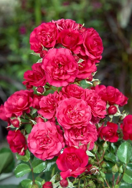 Rosa 'Gärtnerfreude', die Beetrose bzw. Bodendeckerrose Gärtnerfreude, überzeugt als reichblühender Blütenstrauch mit einer Fülle karmin- bis purpurrosa Blüten in dichten Dolden. Von Juni bis in den Herbst hinein zeigt sie ihre halbgefüllten, leicht duftenden Blüten, die sich hervorragend über dem glänzend dunkelgrünen, sehr gesunden Laub abheben. Der Wuchs ist buschig und breit ausladend, mit niedriger bis mittlerer Höhe, wodurch die Sorte als Gartenstrauch ideal zur Flächenbegrünung, für Rabatten und Beete, als niedrige Heckenpflanze, in Gruppenpflanzungen oder als blühender Solitär im Vorgarten geeignet ist. Auch im großen Kübel auf Terrasse und Hof entfaltet diese Kübelpflanze ihren kompakten Charme und sorgt über Monate für Farbe.