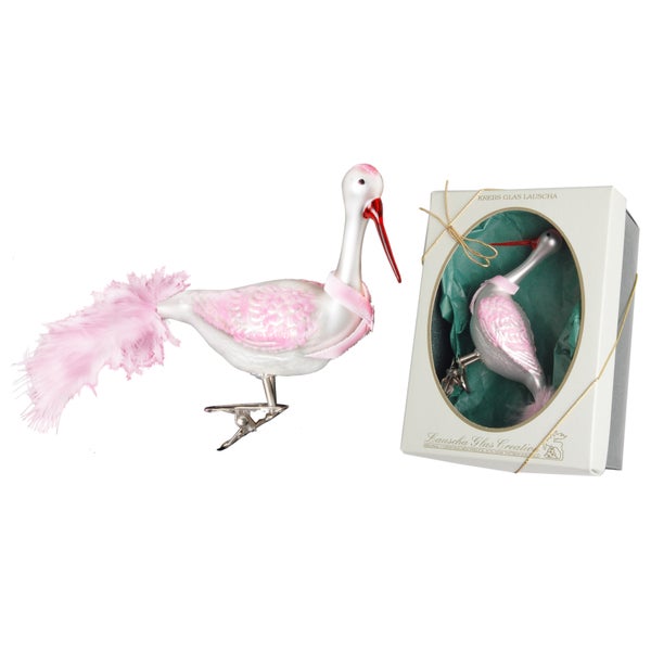 Rosa / Weiß 12cm Storch aus mundgeblasenem Glas mit rosa Schleife auf Clip, handdekoriert mit 6cm echtem Federschwanz (1), 1 Stck., Weihnachtsbaumkugeln, Christbaumschmuck, Weihnachtsbaumanhänger