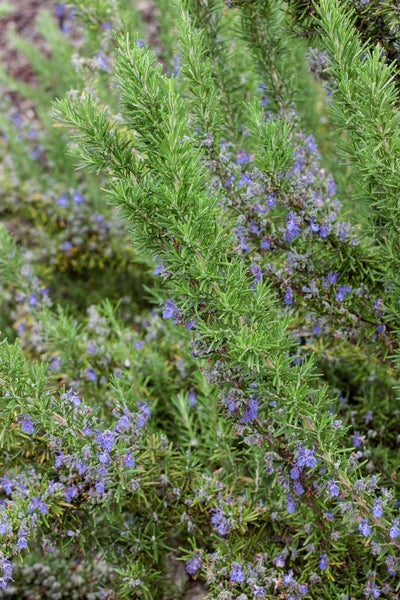 Rosmarinus officinalis ‘Seven Seas’, der echte Rosmarin, ist ein immergrüner Kräuterstrauch mit mediterranem Charme und vielseitigem Zierwert. Diese Sorte zeichnet sich durch einen halb überhängenden, breitbuschigen Wuchs aus, der sich elegant über Mauerkronen, Beetränder und Steingartenkanten legt. Die schmalen, nadelförmigen, dunkelgrünen Blätter verströmen ein intensives Aroma und bilden einen attraktiven Kontrast zu den zahlreichen blau bis violettblauen Lippenblüten, die je nach Witterung von April bis Juni erscheinen und häufig eine zarte Nachblüte im Spätsommer zeigen. Als dekorativer Zierstrauch und praktisches Küchenkraut verbindet ‘Seven Seas’ Nutzen und Ästhetik im Kräuterbeet, im sonnigen Vorgarten, als niedrige Heckenpflanze oder als Solitär in Schalen und Kübeln auf Balkon und Terrasse.
