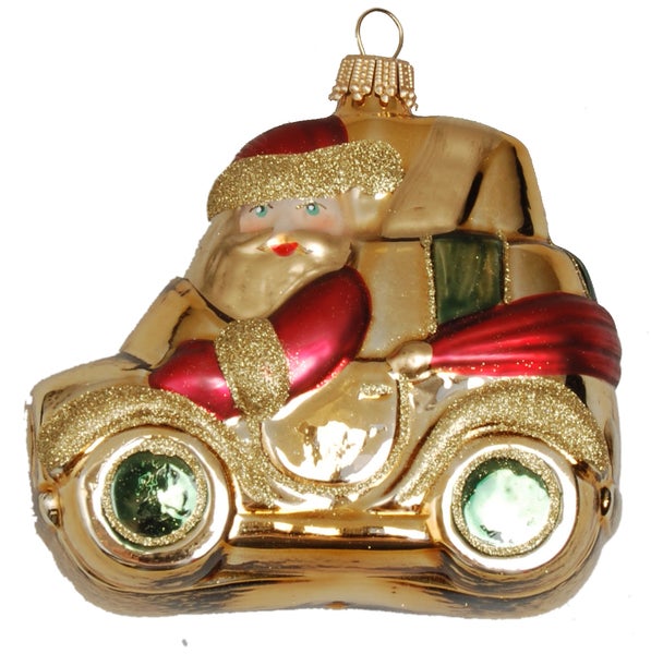 Rot / Gold 9cm Weihnachtsmann in seinem Auto, Glassornament, mundgeblasen, handdekoriert (1), 1 Stck., Weihnachtsbaumkugeln, Christbaumschmuck, Weihnachtsbaumanhänger