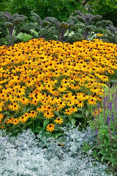 Rudbeckia fulgida sullivantii ‘Goldsturm’, die Goldrudbeckie oder auch Gold-Sonnenhut, ist eine klassische, langlebige Staude, die mit leuchtend goldgelben Zungenblüten und dunkler, kontrastierender Mitte von Hochsommer bis weit in den Herbst hinein begeistert. Der horstige, aufrechte Wuchs bildet dichte, buschige Horste mit frischgrünem, lanzettlichem Laub und erreicht je nach Standort etwa mittlere Höhen, wodurch sich ein harmonischer, kraftvoller Auftritt im Staudenbeet ergibt. Als Blütenstaude setzt sie prägnante Farbakzente in Rabatten, im Bauerngarten oder Präriebeet, eignet sich als strukturgebende Solitärpflanze ebenso wie für stimmige Gruppenpflanzungen und macht auf sonnigen Terrassen als Kübelpflanze eine ausgezeichnete Figur. Auch im Vorgarten sorgt sie für einen gepflegten, repräsentativen Eindruck, und ihre standfesten Stiele liefern langlebige Blüten für die Vase.