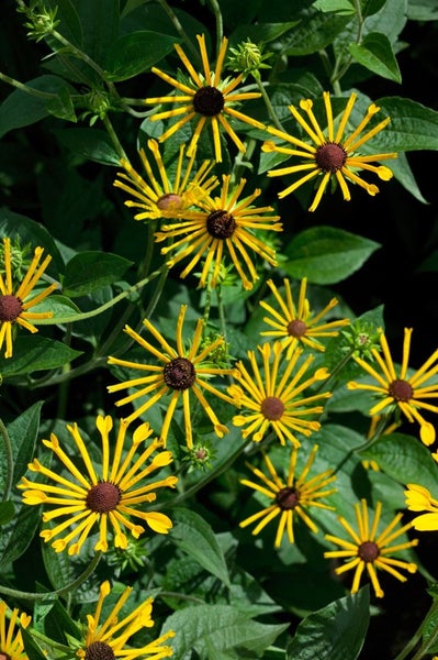 Rudbeckia subtomentosa ‘Henry Eilers’, auf Deutsch oft als Sonnenhut oder Schwachbehaarte Rudbeckie bezeichnet, ist eine charakterstarke Blütenstaude mit unverwechselbarer Optik. Die schmalen, röhrenförmig geringelten Strahlenblüten leuchten in klarem Sonnengelb und umrahmen eine dunkelbraune Mitte; die lange Blütezeit erstreckt sich in der Regel von Hochsommer bis in den Herbst. Das aromatisch duftende, tiefgrüne bis blaugrüne Laub ist kräftig und leicht behaart, der Wuchs horstig, aufrecht und standfest, mit eleganter Höhe, die Beeten und Rabatten vertikale Akzente verleiht. Als Zierstaude für Präriebeete, Bauerngarten und Staudenrabatten überzeugt dieser Blütenstrauch-Charakter sowohl in Gruppenpflanzungen als auch als Solitär im Vorder- bis Mittelgrund. Auf sonnigen Standorten zeigt ‘Henry Eilers’ die reichste Blüte; leicht halbschattige Plätze sind möglich, sofern der Boden nährstoffreich, humos und gleichmäßig frisch bis mäßig feucht bleibt. Durchlässige Substrate verhindern Staunässe, während eine Mulchschicht die Feuchtigkeit hält. In größeren Kübeln kommt die Sorte als Kübelpflanze ebenso zur Geltung, etwa auf Terrasse oder im Vorgarten, wo die markanten, gerollten Blütenbänder moderne wie natürliche Gestaltungskonzepte unterstreichen. Ein Rückschnitt verwelkter Blüten fördert anhaltende Nachblüten, der Hauptschnitt erfolgt im Spätwinter oder zeitigen Frühjahr. In windexponierter Lage kann eine dezente Stütze sinnvoll sein, ansonsten gilt die robuste Gartenstaude als zuverlässig winterhart und pflegeleicht. Auch als langlebige Schnittblume mit guter Haltbarkeit setzt ‘Henry Eilers’ strahlende Akzente in der Vase und komplettiert harmonisch herbstliche Arrangements.