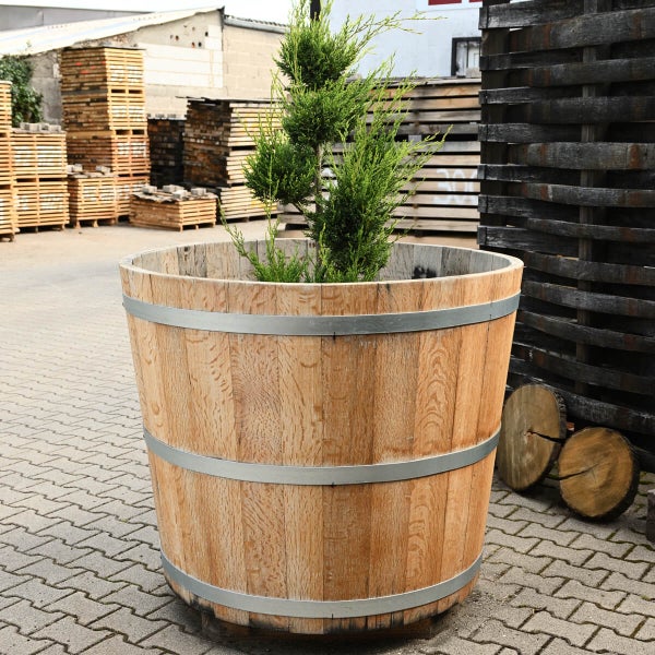 Im Rahmen unserer Fertigung entstehen großformatige Pflanzgefäße, die in unserer Küferei aus Eichen-Fassdauben eines etwa 5000 l Rotweinfasses gefertigt werden und eine charmante Patina tragen. Die äußere Oberfläche der Kübel ist fein geschliffen und für die abschließende Verarbeitung verwenden wir Leinöl. Am Boden des Gefäßes sind Kanthölzer von etwa 10 cm Höhe angebracht, um eine problemlose Handhabung mit einem Stapler oder Hubwagen zu ermöglichen.