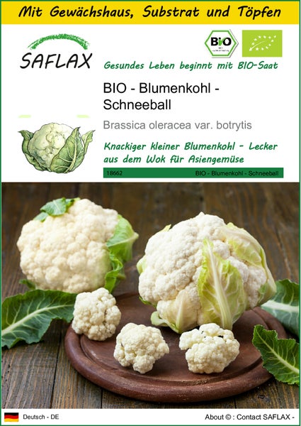 SAFLAX Anzucht Set - BIO - Blumenkohl - Schneeball - Brassica oleracea var. botrytis - 70 Samen - Mit Mini-Gewächshaus, Anzuchtsubstrat und 2 Töpfen