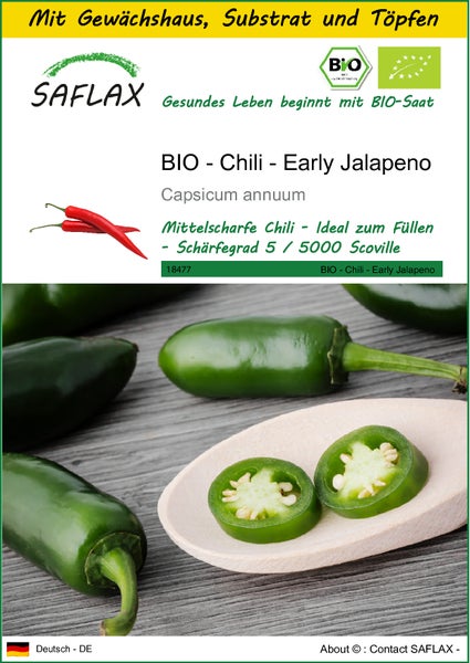 SAFLAX Anzucht Set - BIO - Chili - Early Jalapeno - Capsicum annuum - 20 Samen - Mit Mini-Gewächshaus, Anzuchtsubstrat und 2 Töpfen