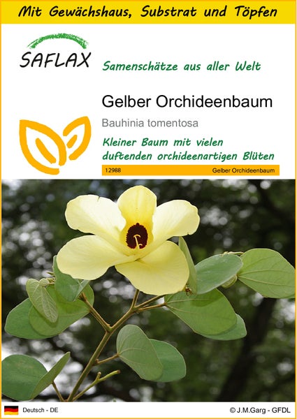 SAFLAX Anzucht Set - Gelber Orchideenbaum - Bauhinia tomentosa - 30 Samen - Mit Mini-Gewächshaus, Anzuchtsubstrat und 2 Töpfen