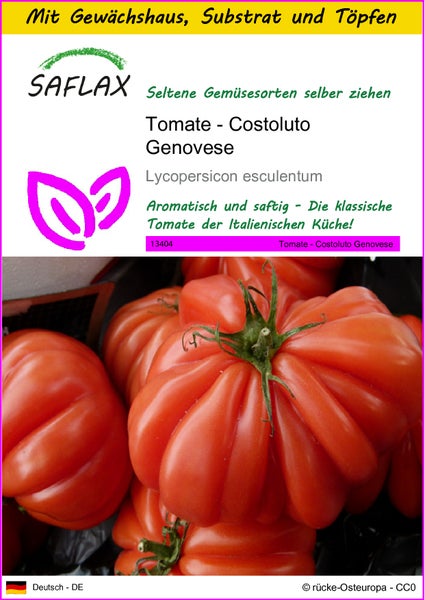 Costoluto Genovese ist eine alte italienische, rotfruchtige, große und saftige Fleischtomate mit platten, gerippten und saftigen Früchten, die In Italien noch im Handel ist. Ihre bis zu 250 Gramm schweren und platzfesten Früchte reifen relativ früh und lange bis in den Oktober. Je länger ihre Früchte reifen, um so feiner entwickelt sich ihr aromatischer Geschmack Der intensive Tomatengeschmack macht sie zur idealen Sorte für Pastagerichte, Salate und Saucen.