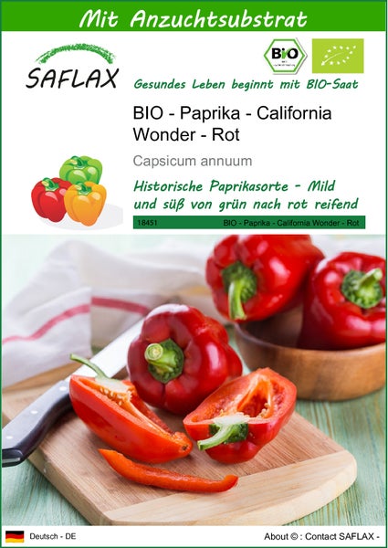 SAFLAX - BIO - Paprika - California Wonder - Rot - Capsicum annuum - 20 Samen - Mit keimfreiem Anzuchtsubstrat