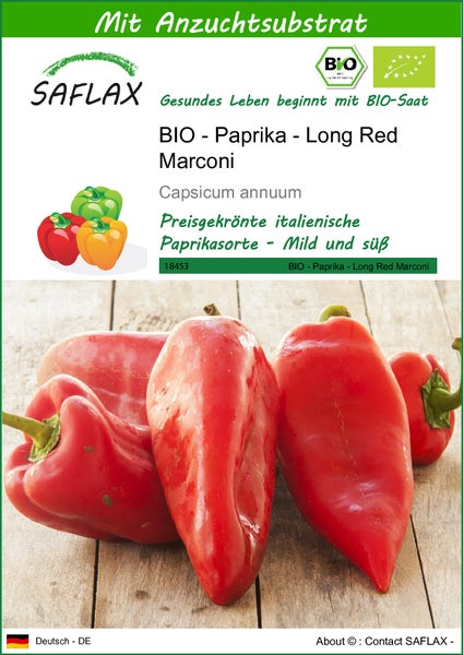 SAFLAX - BIO - Paprika - Long Red Marconi - Capsicum annuum - 20 Samen - Mit keimfreiem Anzuchtsubstrat