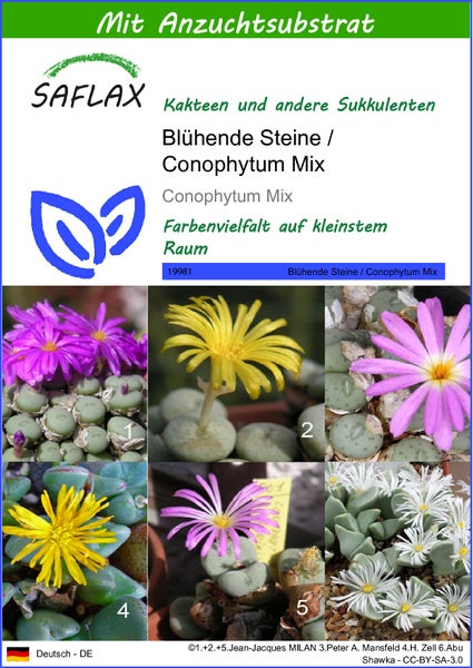 29981-conophytum-mix-seed-package-front-german.jpg - ©1.+2.+5.Jean-Jacques MILAN 3.Peter A. Mansfeld 4.H. Zell 6.Abu Shawka - CC-BY-SA-3.0