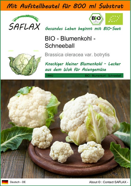 SAFLAX Garden in the bag - BIO - Blumenkohl - Schneeball - Brassica oleracea var. botrytis - 70 Samen - Mit Anzuchtsubstrat im praktischen, selbst aufstellenden Beutel