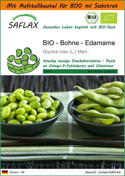 SAFLAX Garden in the bag - BIO - Bohne - Edamame - Glycine max (L.) Merr. - 8 Samen - Mit Anzuchtsubstrat im praktischen, selbst aufstellenden Beutel