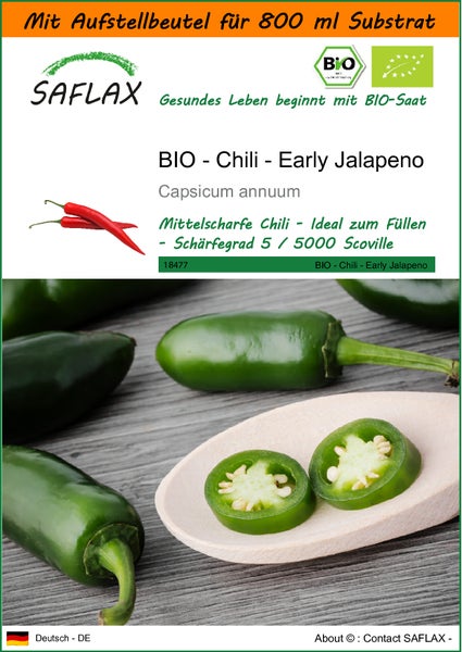 SAFLAX Garden in the bag - BIO - Chili - Early Jalapeno - Capsicum annuum - 20 Samen - Mit Anzuchtsubstrat im praktischen, selbst aufstellenden Beutel