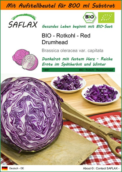 SAFLAX Garden in the bag - BIO - Rotkohl - Red Drumhead - Brassica oleracea var. capitata - 250 Samen - Mit Anzuchtsubstrat im praktischen, selbst aufstellenden Beutel