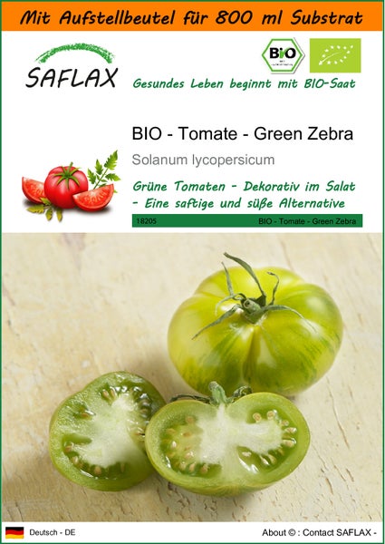 SAFLAX Garden in the bag - BIO - Tomate - Green Zebra - Solanum lycopersicum - 10 Samen - Mit Anzuchtsubstrat im praktischen, selbst aufstellenden Beutel
