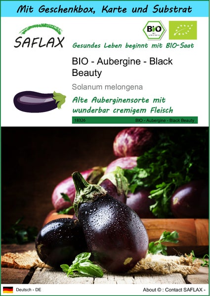 SAFLAX Geschenk Set - BIO - Aubergine - Black Beauty - Solanum melongena - 25 Samen - Mit Geschenkbox, Versandaufkleber, Geschenkkarte und Anzuchtsubstrat