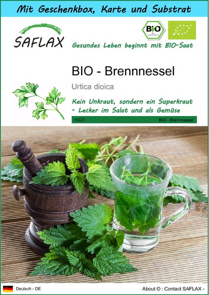 SAFLAX Geschenk Set - BIO - Brennnessel - Urtica dioica - 2000 Samen - Mit Geschenkbox, Versandaufkleber, Geschenkkarte und Anzuchtsubstrat