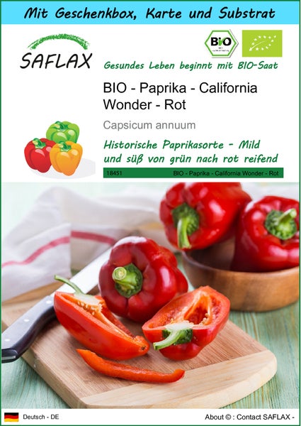 SAFLAX Geschenk Set - BIO - Paprika - California Wonder - Rot - Capsicum annuum - 20 Samen - Mit Geschenkbox, Versandaufkleber, Geschenkkarte und Anzuchtsubstrat