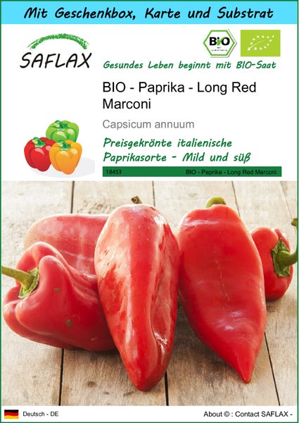 SAFLAX Geschenk Set - BIO - Paprika - Long Red Marconi - Capsicum annuum - 20 Samen - Mit Geschenkbox, Versandaufkleber, Geschenkkarte und Anzuchtsubstrat
