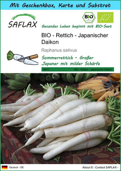 SAFLAX Geschenk Set - BIO - Rettich - Japanischer Daikon - Raphanus sativus - 100 Samen - Mit Geschenkbox, Versandaufkleber, Geschenkkarte und Anzuchtsubstrat