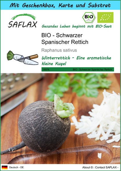 SAFLAX Geschenk Set - BIO - Schwarzer Spanischer Rettich - Raphanus sativus - 100 Samen - Mit Geschenkbox, Versandaufkleber, Geschenkkarte und Anzuchtsubstrat