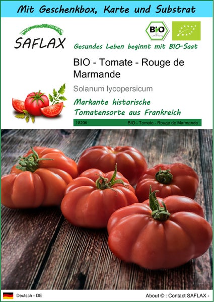 SAFLAX Geschenk Set - BIO - Tomate - Rouge de Marmande - Solanum lycopersicum - 10 Samen - Mit Geschenkbox, Versandaufkleber, Geschenkkarte und Anzuchtsubstrat