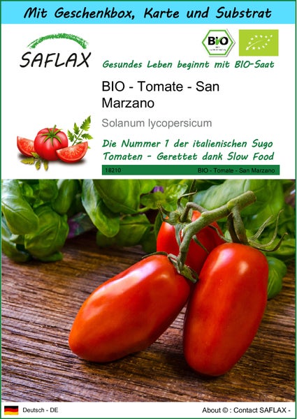 SAFLAX Geschenk Set - BIO - Tomate - San Marzano - Solanum lycopersicum - 15 Samen - Mit Geschenkbox, Versandaufkleber, Geschenkkarte und Anzuchtsubstrat