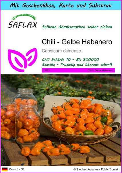 SAFLAX Geschenk Set - Chili - Gelbe Habanero - Capsicum chinense - 10 Samen - Mit Geschenkbox, Versandaufkleber, Geschenkkarte und Anzuchtsubstrat
