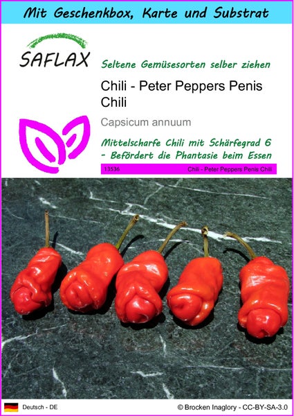 SAFLAX Geschenk Set - Chili - Peter Peppers Penis Chili - Capsicum annuum - 10 Samen - Mit Geschenkbox, Versandaufkleber, Geschenkkarte und Anzuchtsubstrat