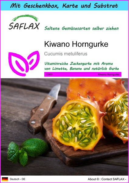 SAFLAX Geschenk Set - Kiwano Horngurke - Cucumis metuliferus - 10 Samen - Mit Geschenkbox, Versandaufkleber, Geschenkkarte und Anzuchtsubstrat