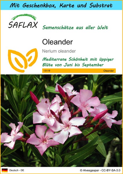 SAFLAX Geschenk Set - Oleander - Nerium oleander - 50 Samen - Mit Geschenkbox, Versandaufkleber, Geschenkkarte und Anzuchtsubstrat