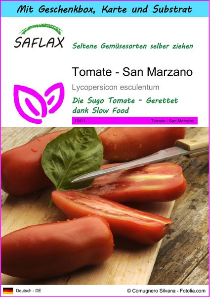 SAFLAX Geschenk Set - Tomate - San Marzano - Lycopersicon esculentum - 10 Samen - Mit Geschenkbox, Versandaufkleber, Geschenkkarte und Anzuchtsubstrat
