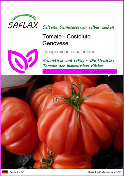 Costoluto Genovese ist eine alte italienische, rotfruchtige, große und saftige Fleischtomate mit platten, gerippten und saftigen Früchten, die In Italien noch im Handel ist. Ihre bis zu 250 Gramm schweren und platzfesten Früchte reifen relativ früh und lange bis in den Oktober. Je länger ihre Früchte reifen, um so feiner entwickelt sich ihr aromatischer Geschmack Der intensive Tomatengeschmack macht sie zur idealen Sorte für Pastagerichte, Salate und Saucen.