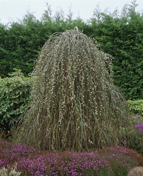 Salix caprea ‘Pendula’, die Hänge-Salweide oder Kätzchenweide, ist ein charmantes Ziergehölz mit elegant überhängender Krone, das schon sehr früh im Jahr Akzente setzt. Noch vor dem Blattaustrieb erscheinen im zeitigen Frühjahr silbrig graue, später goldgelb leuchtende Kätzchen an den kurzen Trieben, die wie ein Vorhang herabfallen und der Pflanze ihren unverwechselbaren Charakter verleihen. Das Laub folgt mit frischgrünen, leicht glänzenden, eiförmigen Blättern, die im Herbst eine dezente Gelbfärbung annehmen. Der Wuchs bleibt kompakt, die Krone entwickelt sich schirmartig hängend und macht die Hängeweide zu einem idealen Solitär für Vorgarten, Hausgarten und als Blickfang am Teichrand. Ebenso überzeugt sie als Kübelpflanze auf Terrasse oder Balkon, wo sie als kleines Gartenbäumchen oder Zierstrauch eine besondere Note setzt und sich gut mit Stauden im Beet kombinieren lässt.