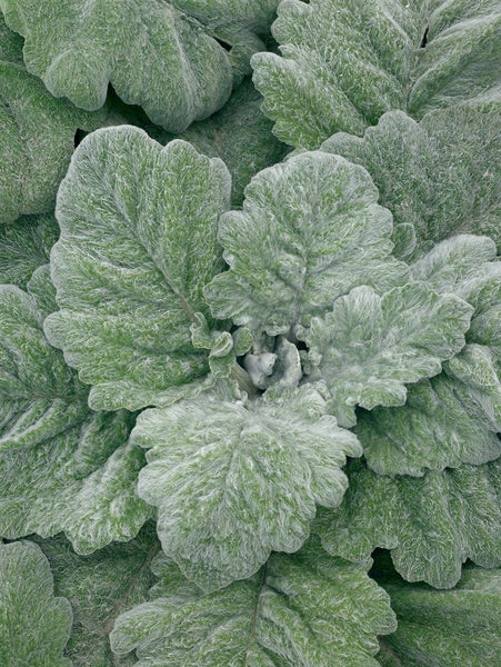 Salvia argentea, der eindrucksvolle Silber-Salbei, ist eine charakterstarke Zierstaude mit außergewöhnlichem Blattschmuck und eleganter Blüte. Die weichen, dicht filzigen, silbrig-weißen Rosettenblätter bilden den Blickfang dieser Blattschmuckstaude und schaffen einen edlen, mediterranen Eindruck im Beet. Im Frühsommer bis in den Hochsommer erscheinen aufrechte, wohlgeordnete Blütenstände mit cremeweißen bis leicht gelblichen Lippenblüten, die über dem Laub schweben und der Pflanze eine architektonische Wuchsform verleihen. Die Rosette bleibt kompakt und breit, während die Blütenstiele je nach Standort etwa 60 bis 100 cm Höhe erreichen, was sie ideal als Solitär im Vorgarten oder als Akzent im Präriebeet macht.