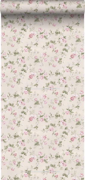 Diese schöne Tapete mit Blumen in Beige und Altrosa sorgt in jedem Wohnraum für eine warme, romantische Atmosphäre. Sie versprüht sogar einen Hauch Nostalgie und lässt an vergangene Zeiten erinnern.