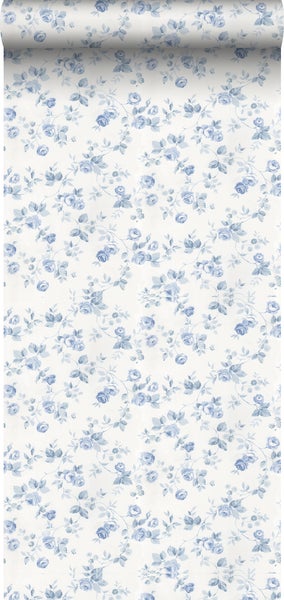 Diese schöne Tapete mit Blumen in Blau und Crême-Weiß sorgt in jedem Wohnraum für eine warme, romantische Atmosphäre. Sie versprüht sogar einen Hauch Nostalgie und lässt an vergangene Zeiten erinnern.
