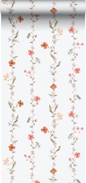 Diese stilvolle Tapete mit Blumen in Orange und Weiß verleiht jedem Wohnraum einen romantischen, vintage Touch. Die Tapete hat eine schöne matte Oberfläche und sorgt für eine warme und stimmungsvolle Atmosphäre.