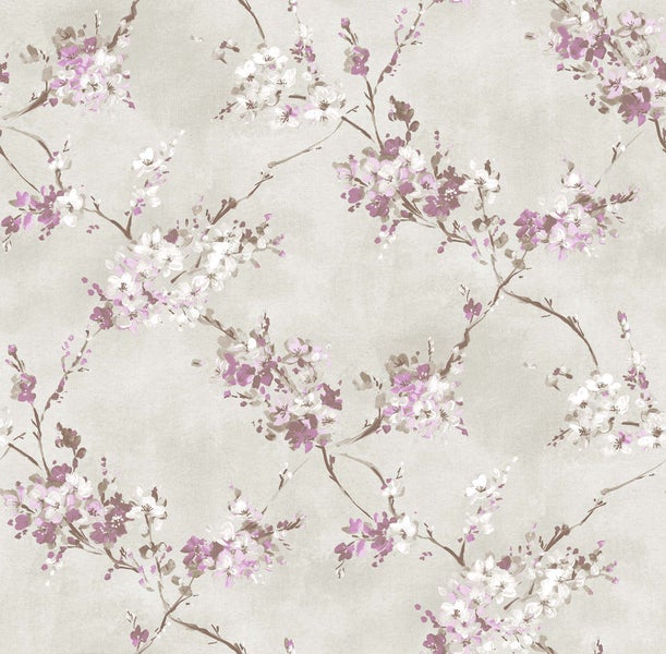 Diese schöne Tapete mit Blumen in Violett und Beige sorgt in jedem Wohnraum für eine warme, romantische Atmosphäre. Sie versprüht sogar einen Hauch Nostalgie und lässt an vergangene Zeiten erinnern.