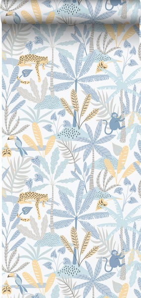 Sanders & Sanders Tapete Dschungeltiere Blau, Grau und Gelb 53 cm x 10.05 m