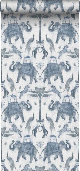 Diese stilvolle Tapete mit Elefanten in Graublau gibt jedem Wohnraum einen exotischen Touch und sorgt für ein warmes und stimmungsvolles Ambiente.
