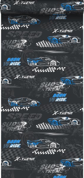 Sanders & Sanders Tapete Rennwagen Blau und Schwarz-Weiß 50 x 900 cm