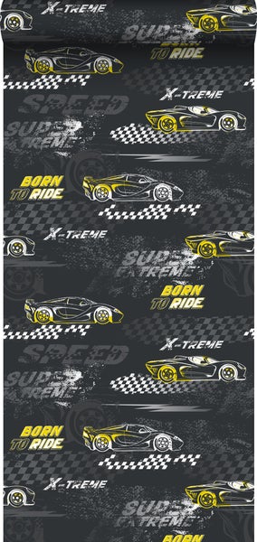 Sanders & Sanders Tapete Rennwagen Gelb und Schwarz-Weiß 50 x 900 cm