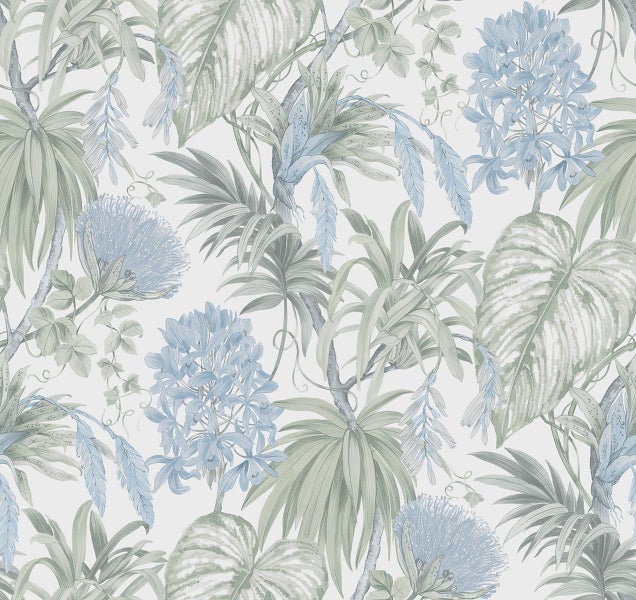 Diese schöne Tapete mit tropischen Blättern in Blau und Grün verleiht jedem Wohnraum einen botanischen Look. Typisch für den botanischen Stil sind satte Grüntöne, helle und frische Farben, natürliche Materialen und vor allem richtig viel Pflanzen.